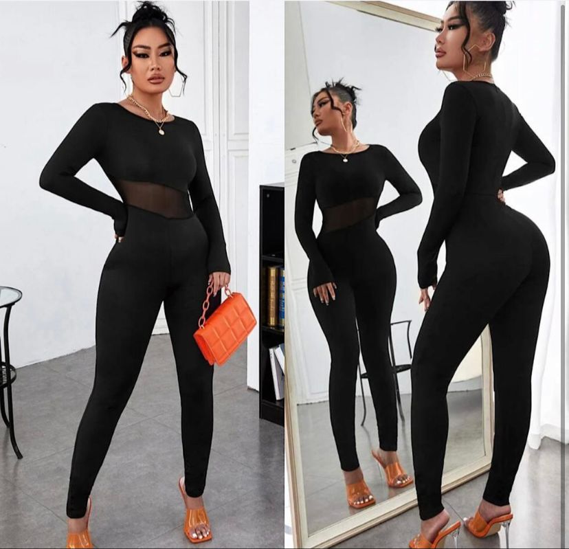 Enterizo manga larga con transparencia en abdomen, de tela gruesa y licrada.
